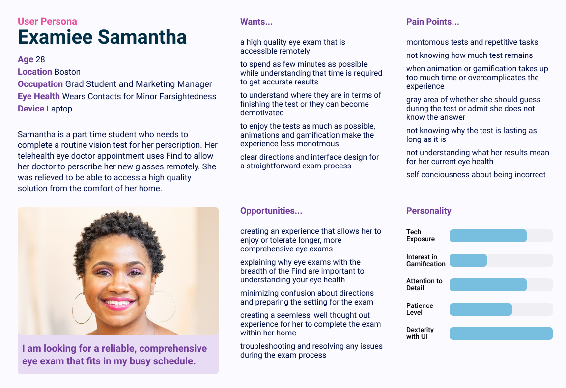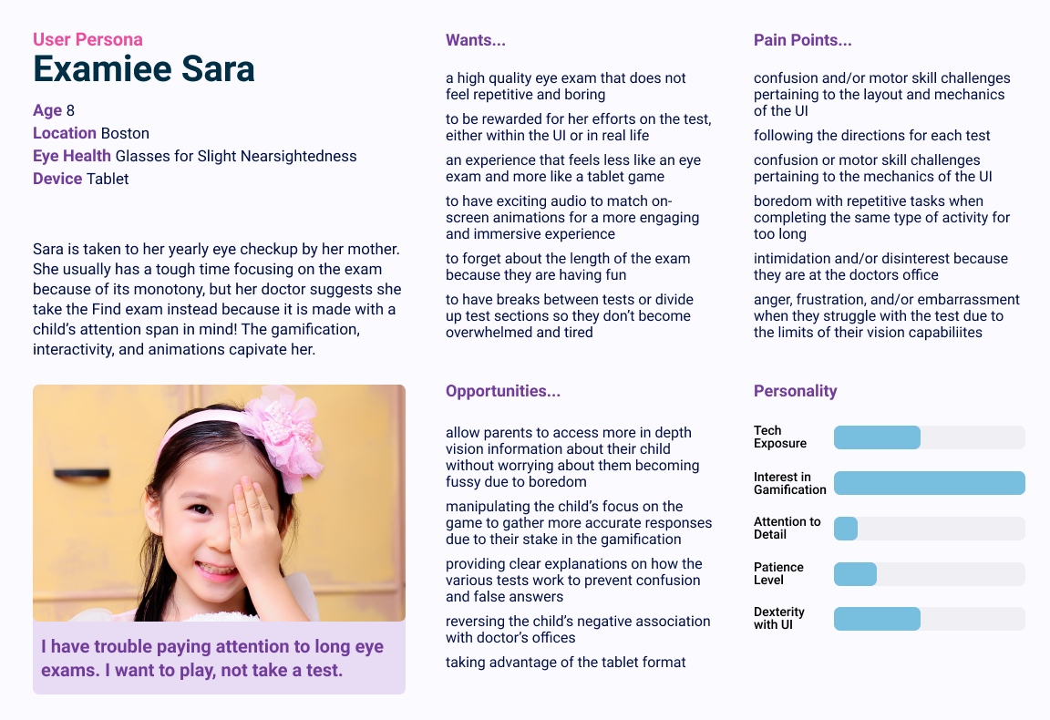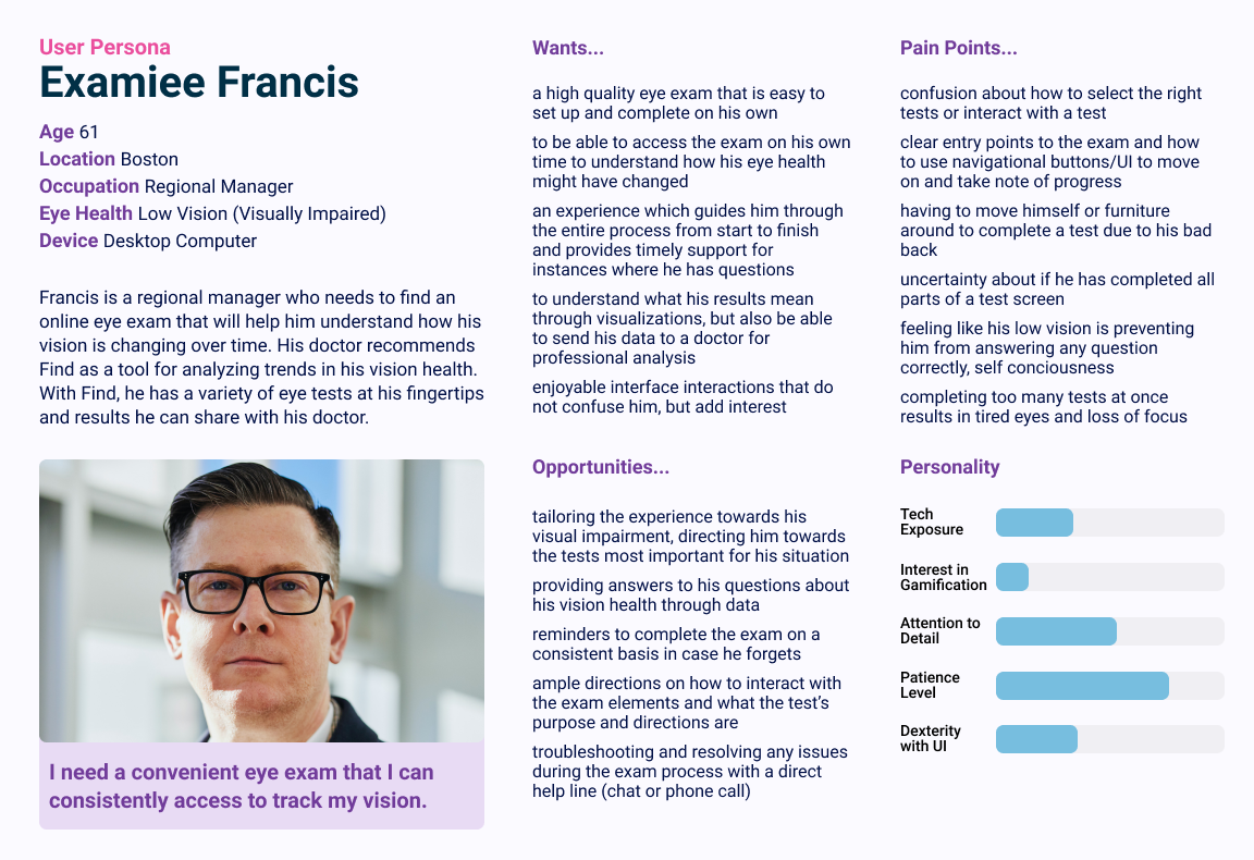 With the empathy map and initial meetings with our clients as a starting point, we crafted three user personas to cover the following key differences noted in our user population: